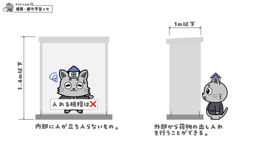 上記の内容だと、具合的な数値が入っていないよね。だから、分かりやすく判断するために、日本建築行政会議では「奥行きが1m以内のもの又は高さが1.4m以下のもの」としているよ。